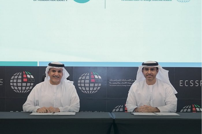 H.E. Ambassador Dr. Khalid Ghanim AlGhaith, Secretary-General of the Higher Committee of Human Fraternity, signed a Memorandum of Understanding (MoU) with H.E. Dr. Sultan Mohammed AlNuaimi, Director General of the Emirates Center for Strategic Studies and Research.